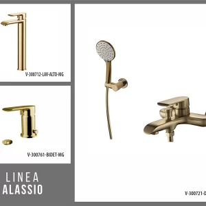 Juego de griferia completo. incluye ducha externa con telefono, lavatorio alto y bidet oro semi mate aqualia – dorado
