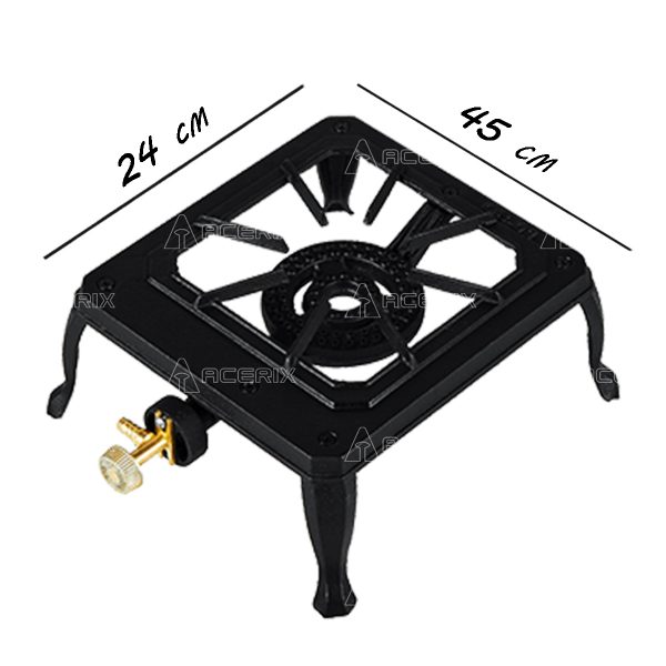 Anafe a gas de un quemador. * 100% hierro fundido. * Medidas: 23.5 x 25.5 x 12,5 cm. (ancho, profundidad, alto) * Color: Negro * Apta para garrafas de 3 y 13 kg.